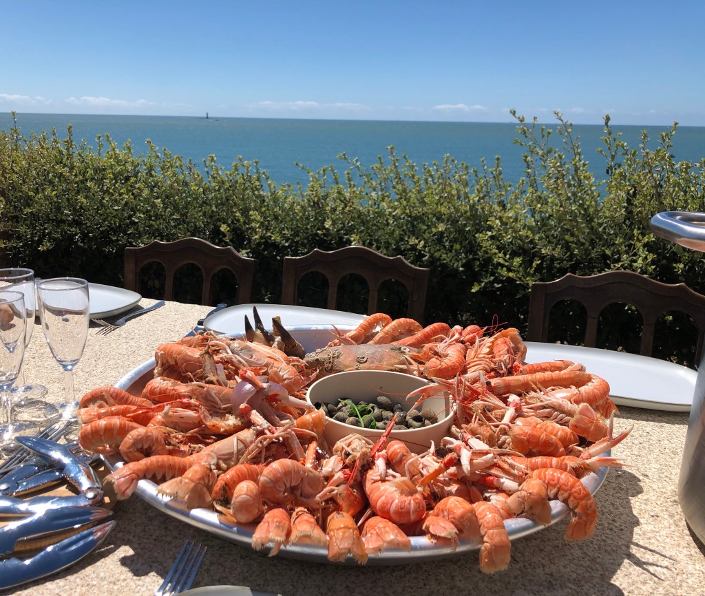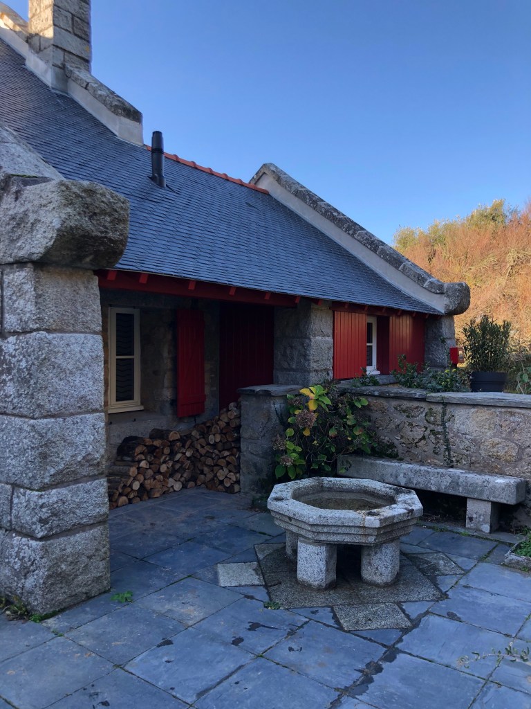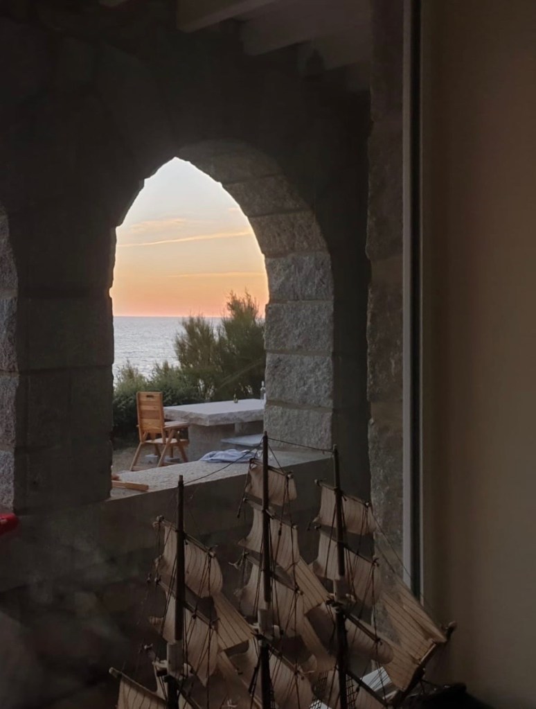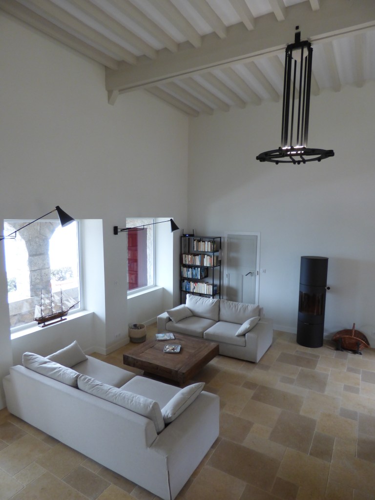 Un grand salon d’un peu plus de 60 m2 intégrant une cuisine : il donne des deux côtés de la maison, ce qui veut dire soleil le matin côté jardin et soleil le soir côté mer. La cuisine est équipée de façon moderne pour permettre de servir une dizaine de personnes : piano de cuisson, lave-vaisselle, réfrigérateur congélateur, cafetière nespresso, cafetière filtre, bouilloire, grille-pain. Vous y trouverez également une grande table pour 10 personnes, les canapés et fauteuils qui forment le coin salon, et un poêle a bois pour les soirées au coin du feu.